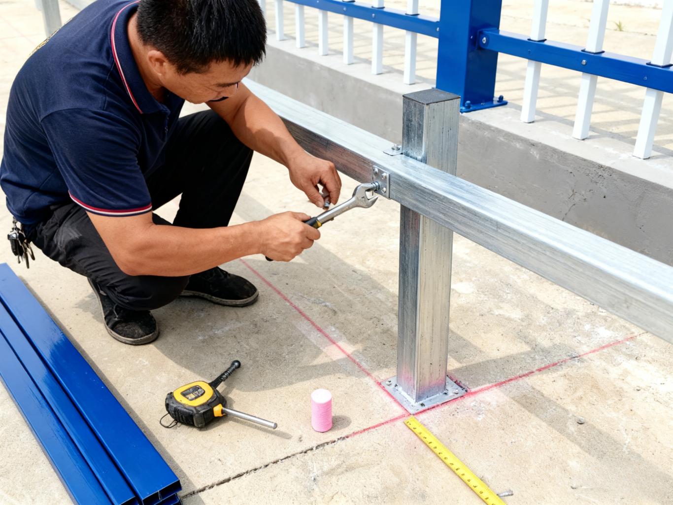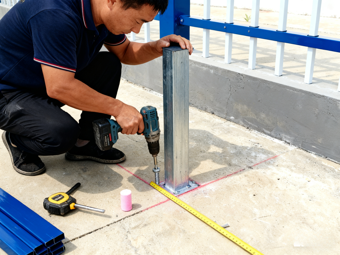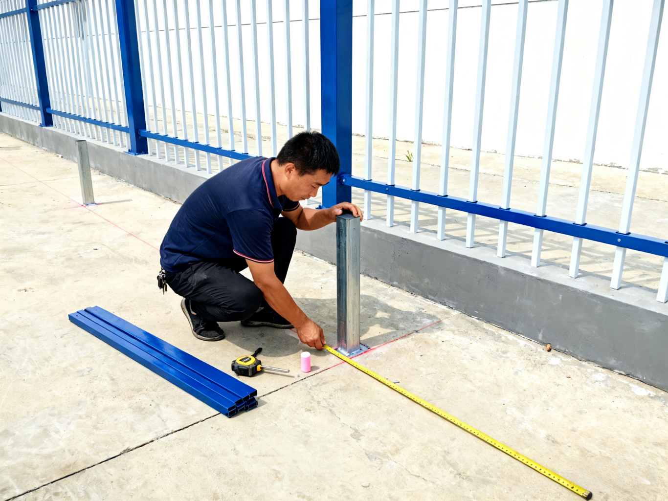 · 用卷尺测量围墙边界,确定立柱位置